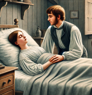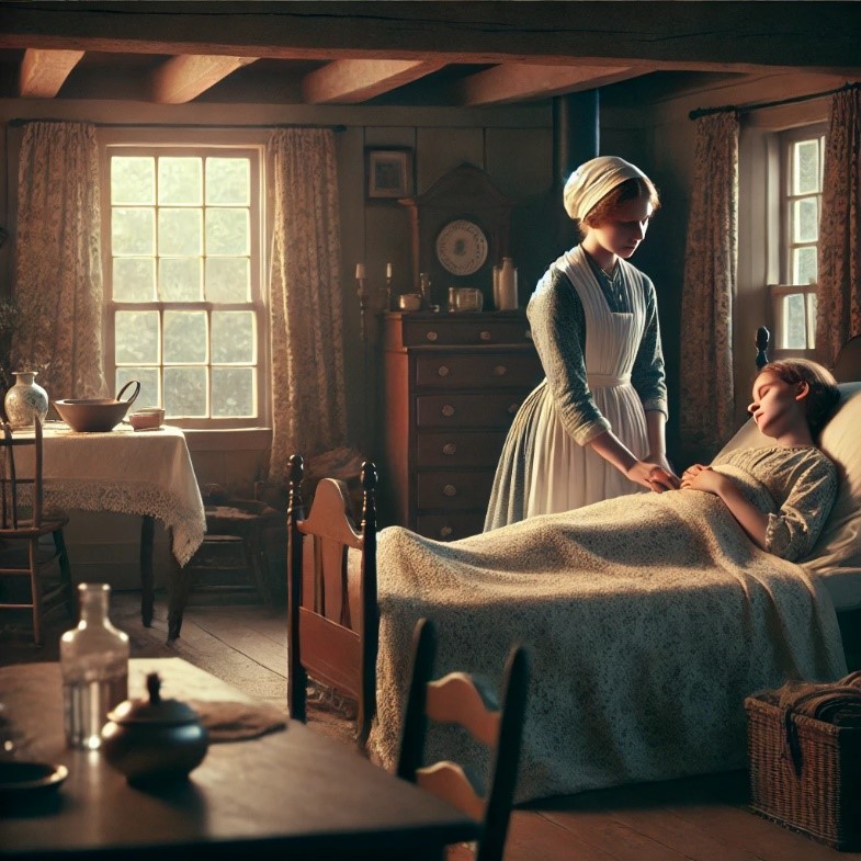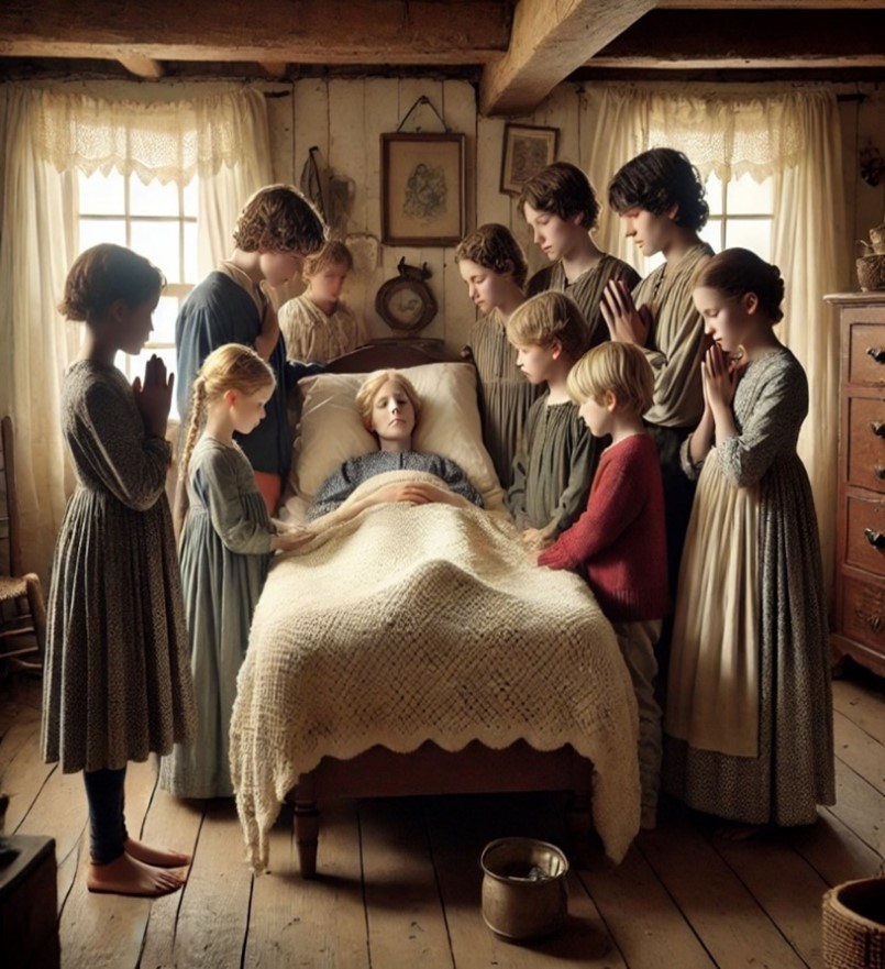 At the age of 16 the care of Lovina became mostly mine for three years. I remained at her bedside and if I left her, it was only for an hour or so. There was no cure for consumption in those days.  With the disease Lovina wasted away and weighed no more than a child and I was able to carry her. As she was dying, I carried Lovina to her bed and my hand slipped, and she cried out, “Oh! Sister that hurt me.” Knowing I had hurt my sister who I loved so dearly in her last moments wounded me very much. My heart was truly broken, and my health became affected. I became pensive and melancholy and life held no joy for me. I had anxiety of mind and needed God’s peace.