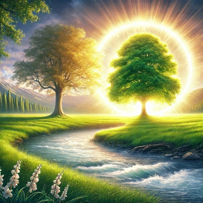 These trees were well proportioned and towered with majestic beauty to a great height. I gazed upon them in wonder and admiration. I saw that one of the trees was surrounded with a bright belt of light that shone brighter than burnished gold. A gentle breeze came up and the tree encircled with light bent gracefully and waved its branches. The wind increased and the tree became more animated and seemed to express joy and happiness as it moved. The stream shared the same joy and gratitude as the tree surrounded in light. They moved in unison, increasing continually in light until the scene became exceedingly glorious to behold.